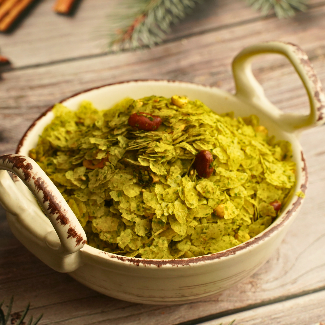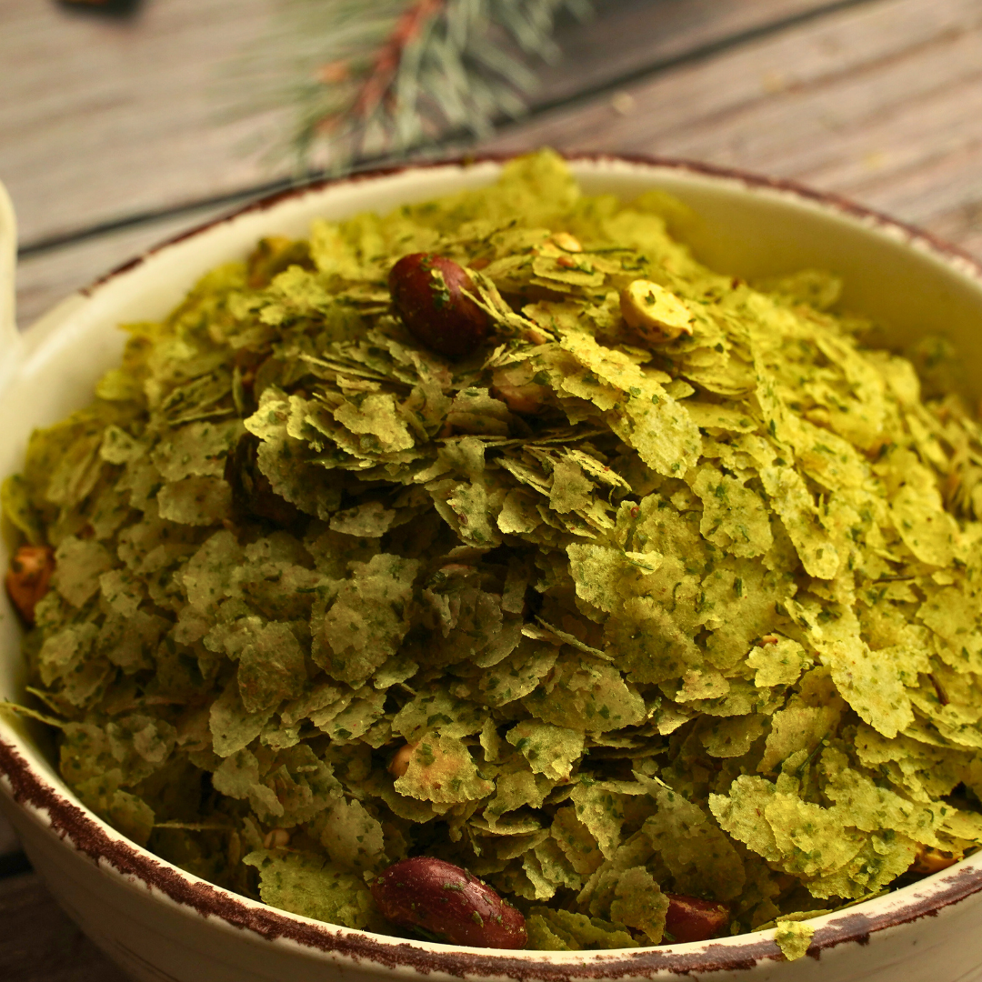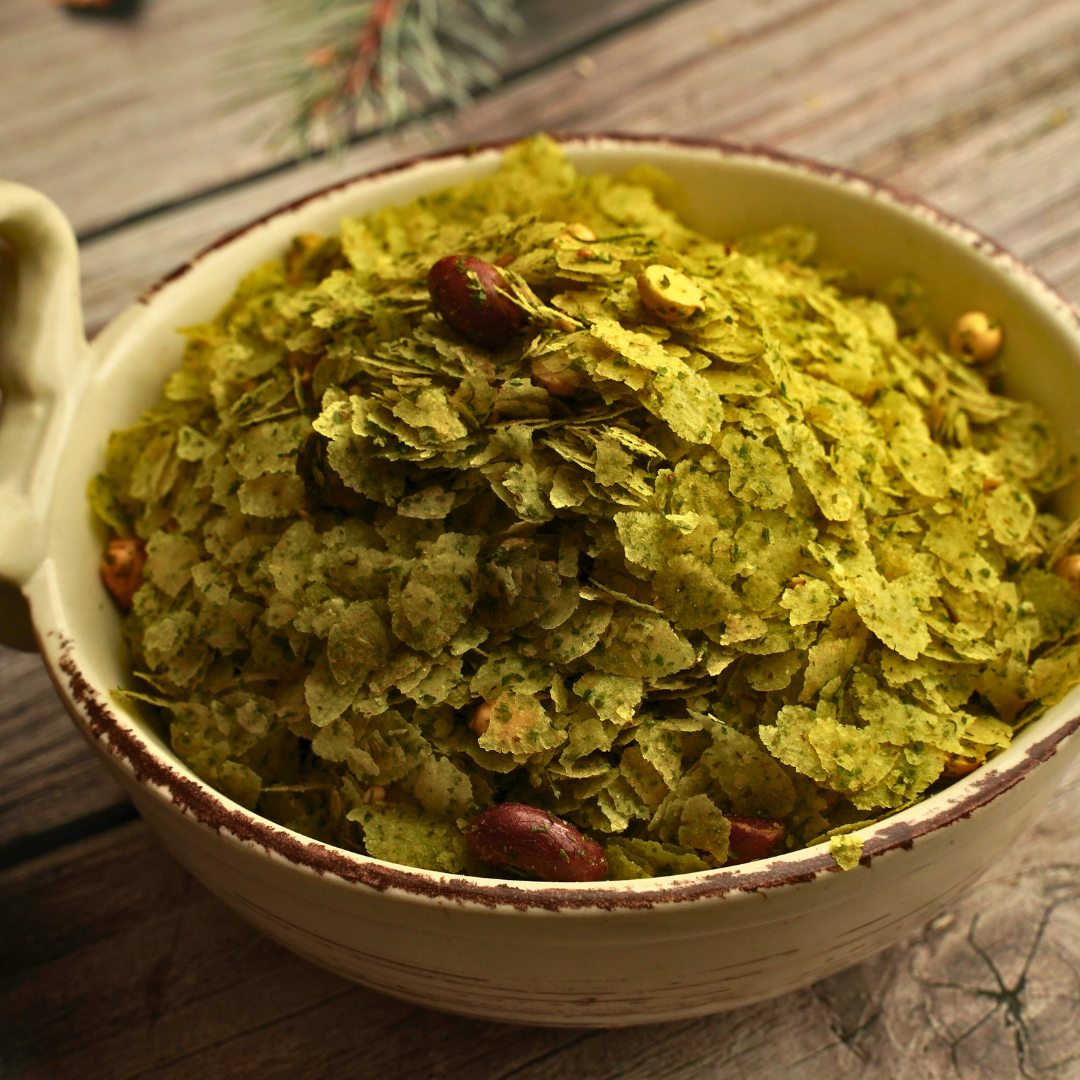 Kothambir Chivda is a traditional fried snack made with flattened rice, crunchy peanuts, and a range of flavorful spices. It's an easy way to snack healthy, as its ingredients are cholesterol-free and high in fiber and protein. Enjoy the crunch and flavor in Kothambir Chivda!